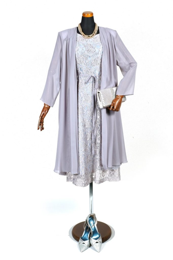 ライトグレーの繊細なリバーレースが上品な印象を感じさせるワンピース。シフォンのミディアムガウンを合わせる事で一層の華やかさと柔らかさをプラス。上品でトレンド感あるフォーマルなドレス。