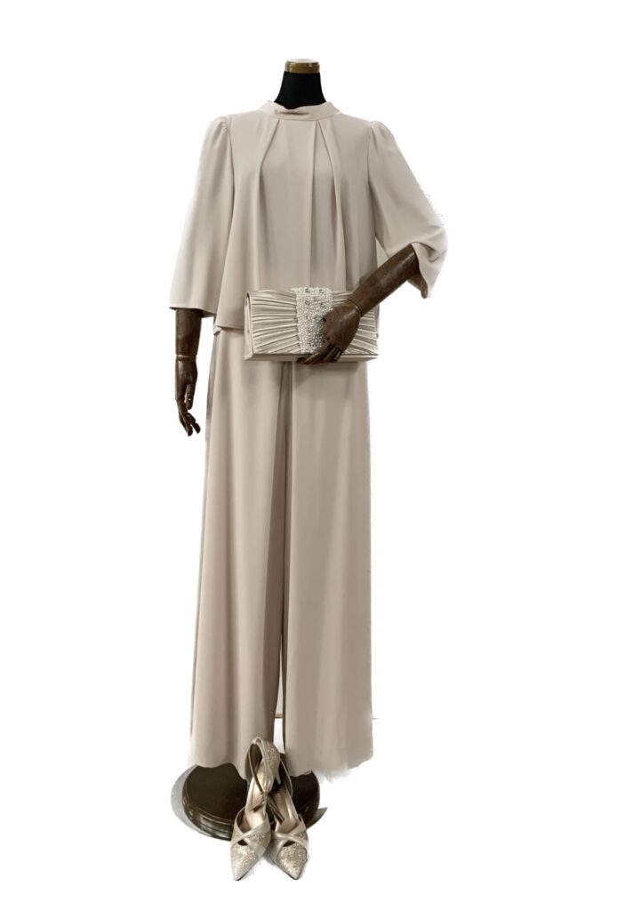 明るいピンクベージュのパンツスタイルは、華やかなお席にピッタリです。お色違いでブラックもございます。
