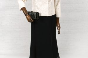 首元にタックを寄せ、表情を出しています。温かみのある、ピンクゴールドの生地に、植物柄の刺繍を施したジャケットは、チャーミングなお母様にお勧めです。