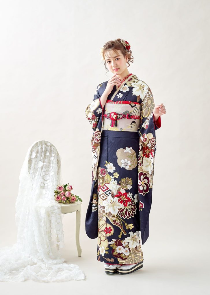 濃紺に豪華な現代古典の柄行が、晴れの日に相応しい一着。差し色のワインを小物でコーディネートする事でより華やかにな印象に。