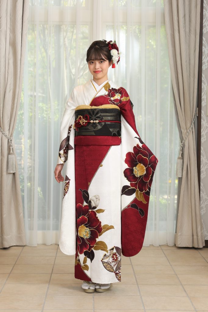 大胆に描かれた椿がインパクトのある一着。今人気なモダンでシンプルな振袖は、お洒落でクールな印象に。