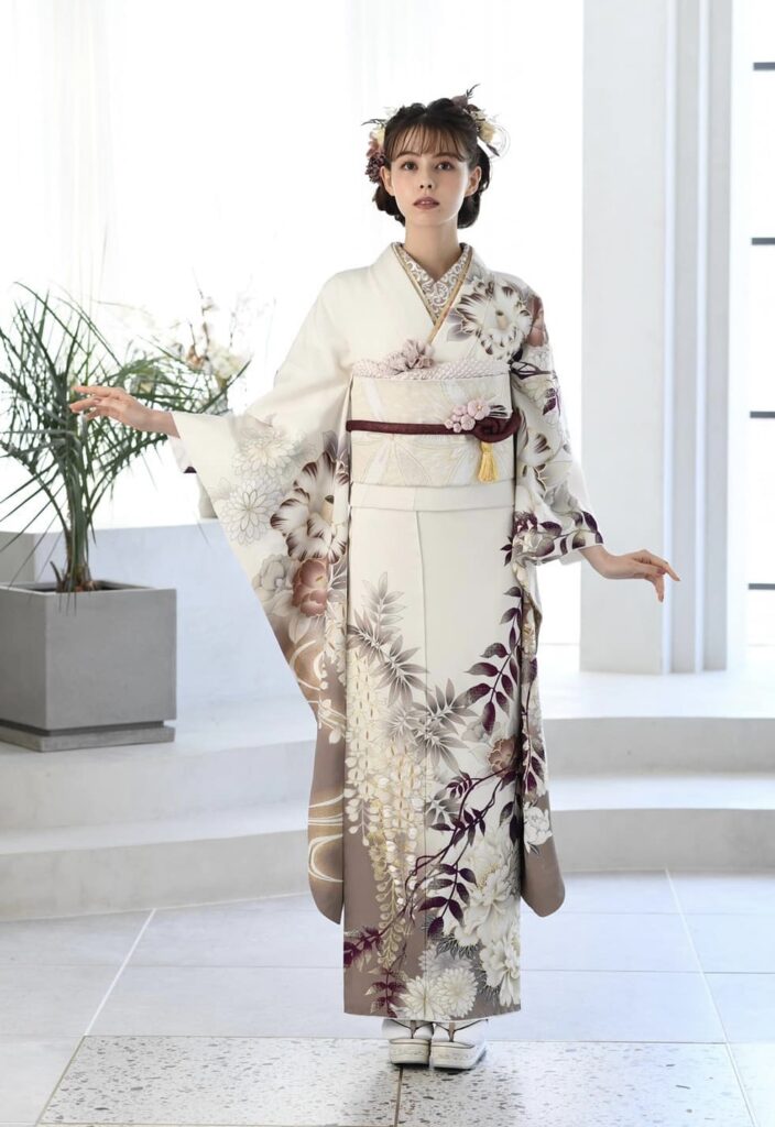 クリームとベージュのニュアンスカラーは現在トレンドのくすみ系振袖。差し色で描かれた葉のワインが大人っぽく女性らしい印象を与えます。帯、小物もベージュ系でコーディネイトすると、今一番人気のワントーンコーデの出来上がり!