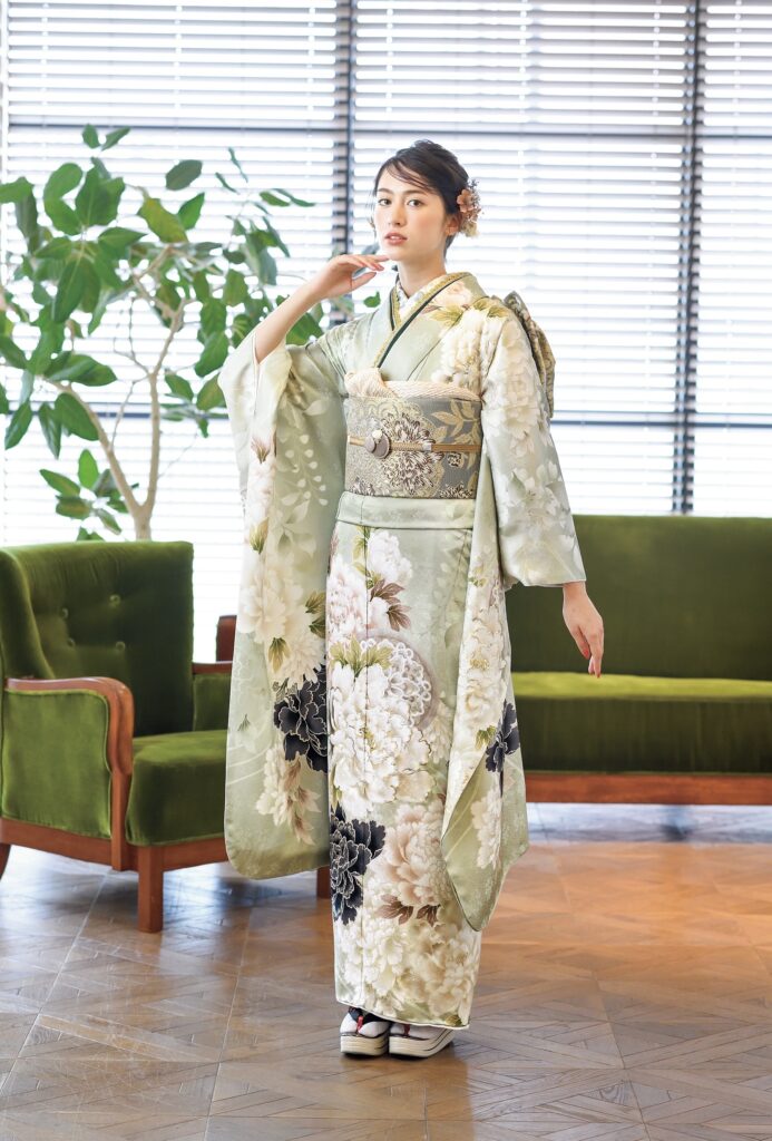 優しい印象のミントグリーンのレンタル振袖。上品な印象の色合いに大胆に描かれた大振りな白と灰茶色のボタンが大人っぽさをプラスします。くすみカラーのお着物は現在大注目のデザインです。