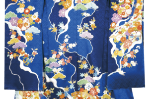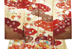 大胆な束ね熨斗が豪華に描かれた伝統的な振袖は、晴れの日に相応しい逸品。