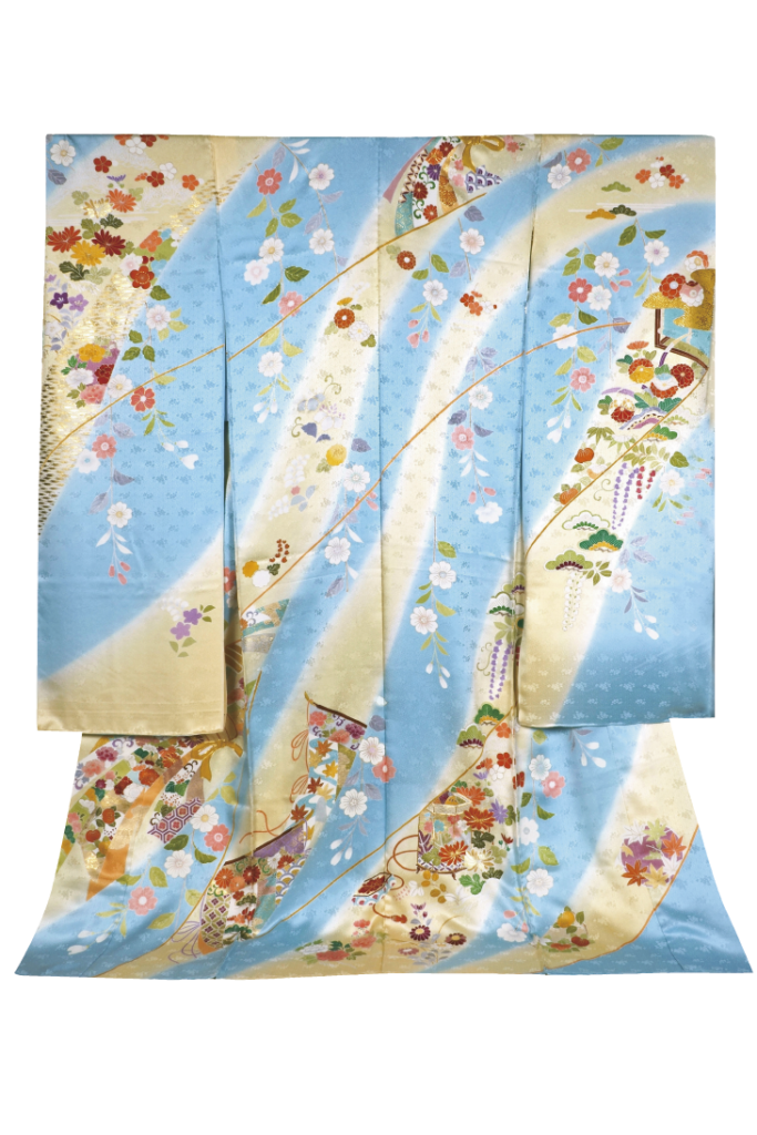 優しく清楚な色合いと束ね熨斗の意匠が織りなす格調高さと上品さが魅力の京友禅。