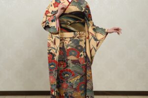 沖縄の伝統的な技法『紅型』の振袖。柔らかな茶色地に、黄色・オレンジ色の配色が珍しい配色の一着。大人っぽさの中にも、可愛らしい雰囲気で着こなすことができます。