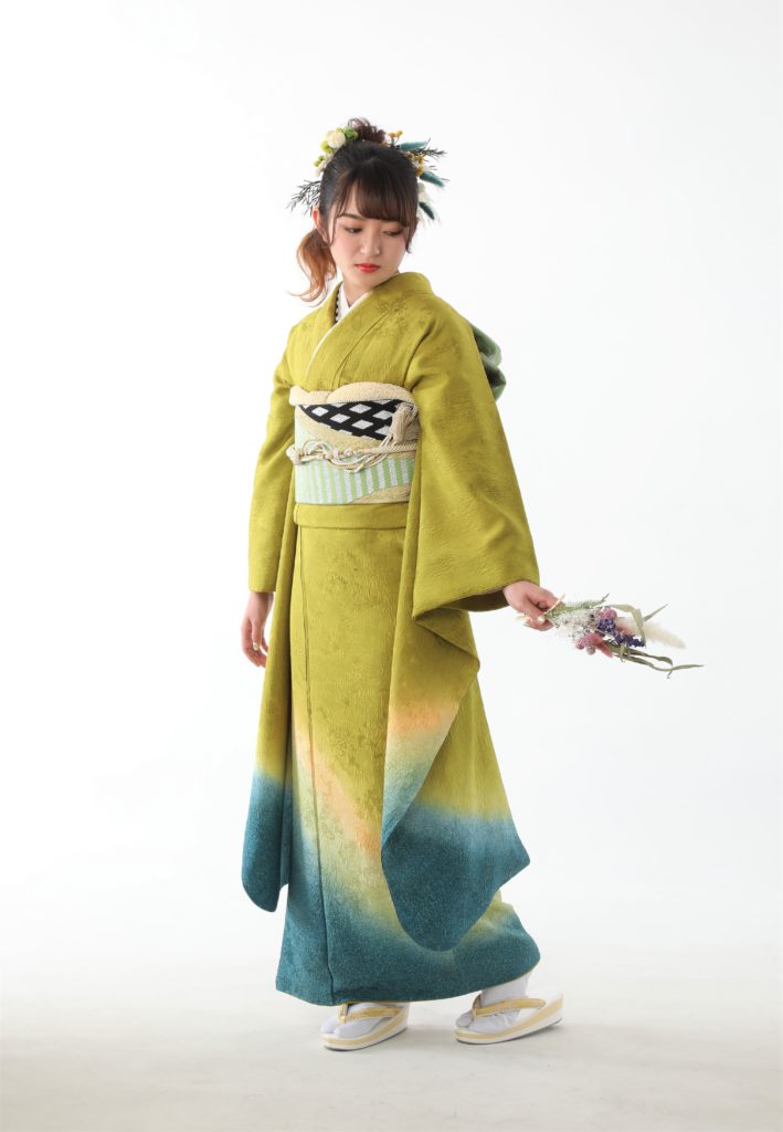 “誰かと一緒はイヤ!”そんなお嬢様におすすめの特別な一着です。色無地のグラデーションだけのシンプルな振袖だから小物遊びで友達と差をつけて!