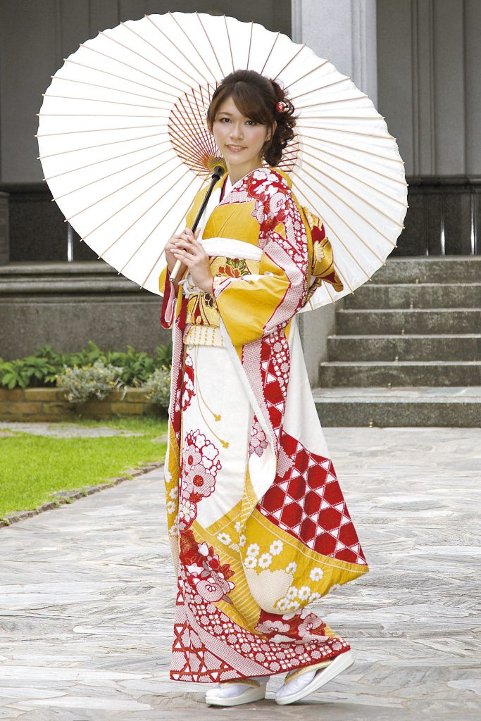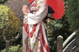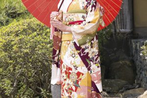 白地に黄、赤色の文様が鮮やかで若々しく、爽やかな印象です。とても個性的な振袖を赤色の帯と白色の小物でより一層おしゃれに楽しんで!