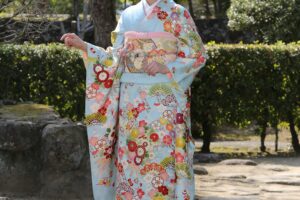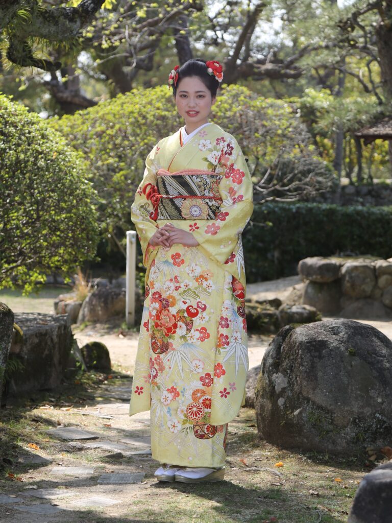 花籠からあふれんばかりに描かれた四季の花々が淡黄色の振袖を彩ります。古典的で可愛い雰囲気を好まれるお嬢様にお勧めの一着。