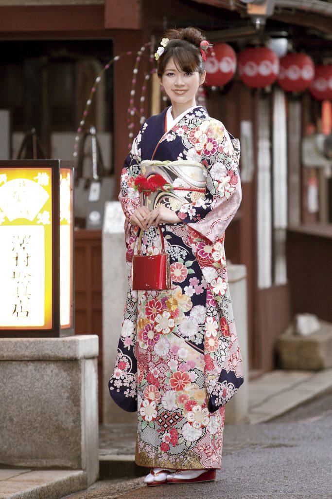 紺色の地に色鮮やかな大小の花々を咲かせた、上品な中に可愛らしさを感じさせる振袖。挿し色の赤がより華やかな印象に。
