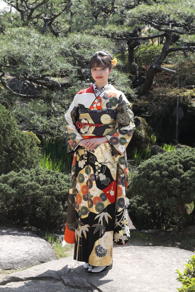 金箔をふんだんに使用した豪華絢爛な一着。かんざしや黒の小物をコーディネートして粋に着こなして。