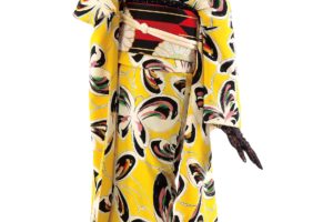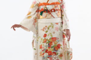 珍しい薄群青(うすぐんじょう)色に貝桶と松竹梅が愛らしく描かれた「千總」の振袖です。上品で20歳ならではの初々しさが感じられる一着です。