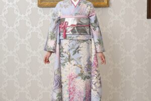 地色は茶色で大人っぽい振袖。桜・松竹梅・牡丹など四季折々の花模様が彩りを添える可愛く優しい印象の一着。