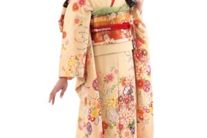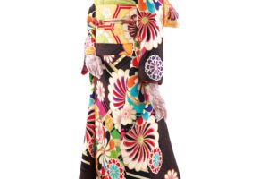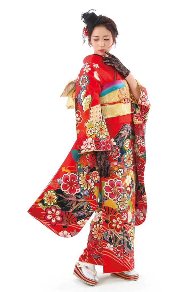 古典柄を現代風にアレンジした鮮やかな赤の振袖。ハットとレースの手袋を合わせたコーディネートでお友達と差をつけて。
