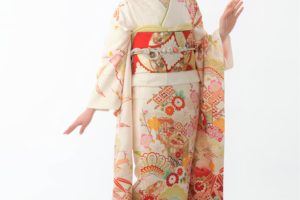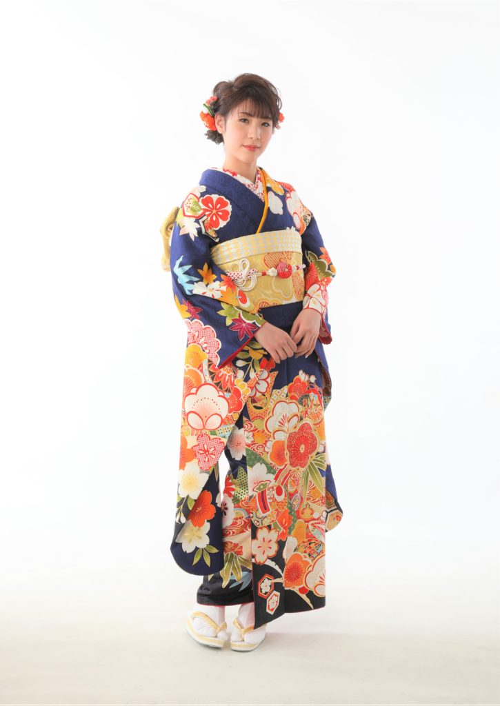 明るい紺色地に橙色や朱赤の色鮮やかな大輪の花々が咲き誇り、可愛らしさと豪華さを合わせ持った、成人式ならではの振袖。