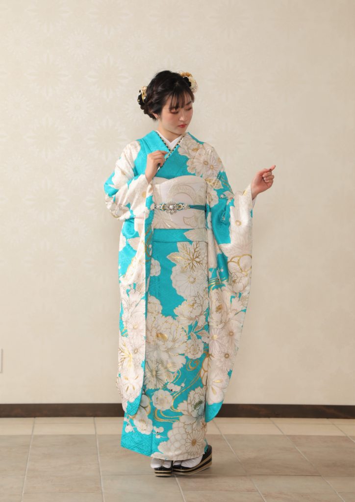鮮やかなブルーの着物に大振りな牡丹の柄が目を引く一着。青・白・金でまとめた、モダンなコーディネートは「可愛すぎるのは苦手」なお嬢様にお勧め。