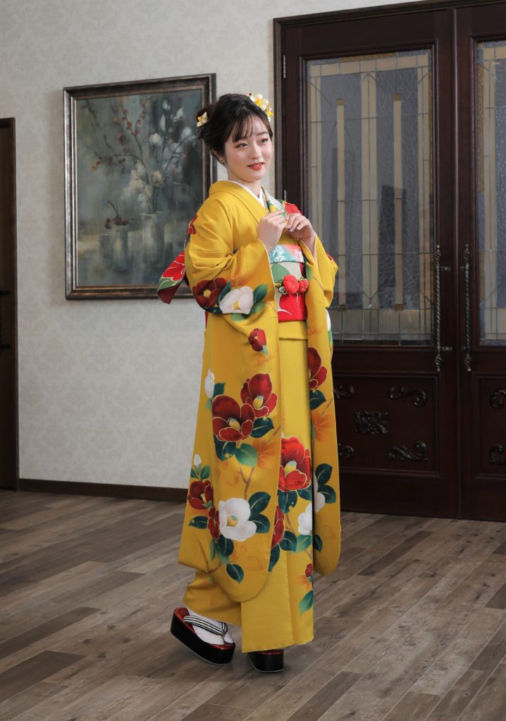 鮮やかな黄色の振袖に、赤・白の椿が映えるレトロモダンな振袖。帯や小物をこだわり抜いたコーディネートは、晴れの日に相応しい一着です。