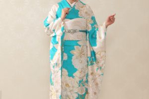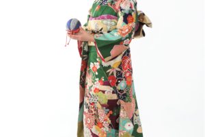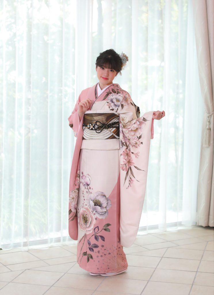 大胆に描かれたラナンキュラスの振袖。くすみピンクの大人可愛い振袖に、ブラックゴールドの帯を合わせることでスタイリッシュに着こなす事ができます。