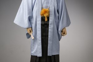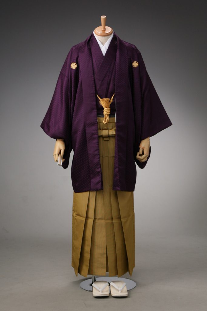 男性に人気の紫の中でも、高貴な色調の紋付。豪華さを感じさせる金茶色の袴で、アバンギャルドな殿様風は、いかがでしょう。組合せは自由!衣裳レンタルと着付・写真撮りがセットになった、お得なパックプランもございます。