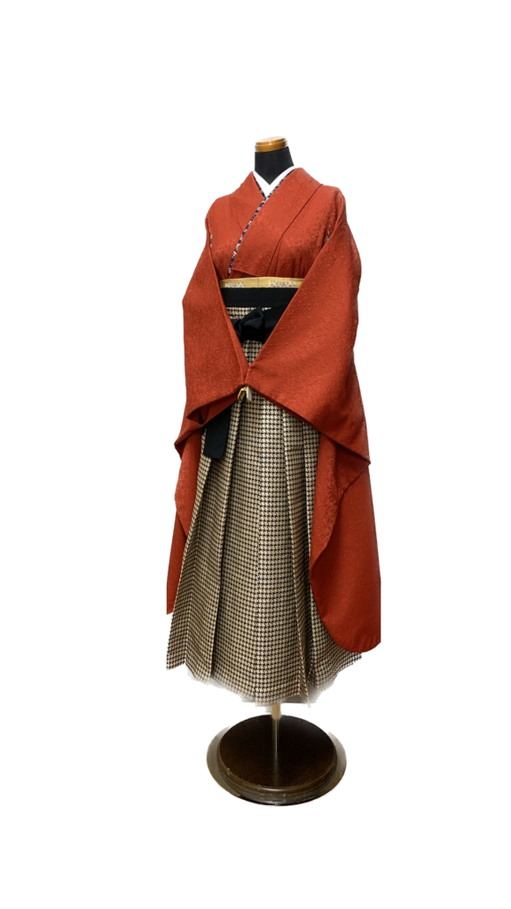 『トレンドの無地着物を少し個性的に着たい!』そんな方にお勧めのレンガ色の花紋付きのお着物。無地着物だからこそ合わせる袴は柄入りで遊び心をプラスしてコーディネイトがお勧め!