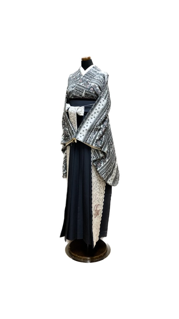 モノトーン配色のゴシック調のクラシック着物は一般的な古典柄やトレンド柄とは違うシックな印象を与えてくれます。ブラックの袴でシックなテイストでも、レースの袴をコーディネイトしてとことんゴシック感を出しでも良し!他の子と差をつけてお楽しみいただけます。