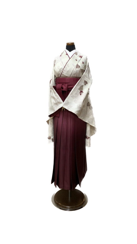ベージュの地色に優しい色合いの薔薇を全体描いバーガンディカラーとグレーブラウンがアクセントとなり上品で大人っぽい印象に。バーガンディやブラウンの袴を合わせる事でトレンド感をプラスします。