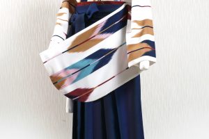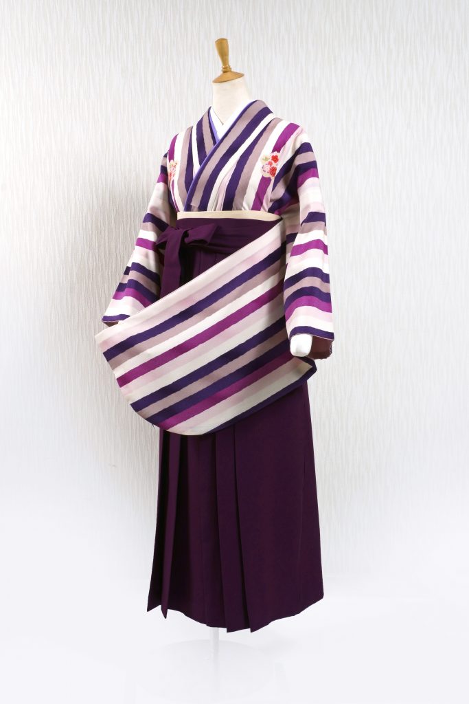 紫の濃淡のストライプが大正ロマンを彷彿とさせます。同系色の袴を合わせて、統一感のあるすっきりとしたコーディネートがお勧めです。卒業袴の≪福茂≫ならレトロから最新トレンドまで地域一番の品揃え!