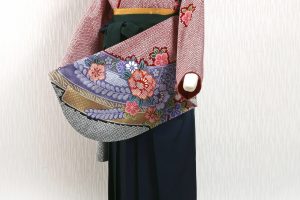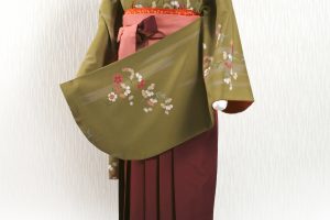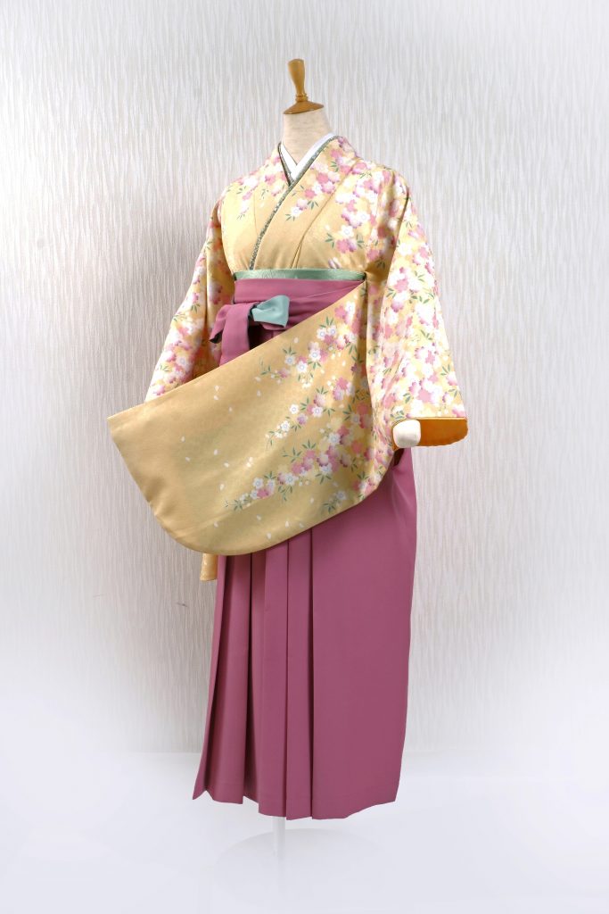 やさしい黄色に、ピンクと白の枝垂れ桜が上品で、卒業式シーズンにぴったりの春らしい一着です。ピンクの袴で可愛らしさをプラス。卒業袴の≪福茂≫ならレトロから最新トレンドまで地域一番の品揃え!