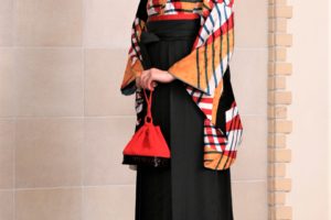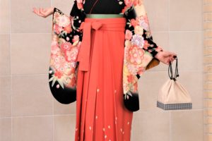 白地に映えるビビットな色づかいの文様が、個性的で華やかな一着。赤の袴をあわせて、卒業袴ならではの可愛らしさを楽しんで!卒業袴の≪福茂≫なら、レトロから最新トレンドまで地域一番の品揃え!