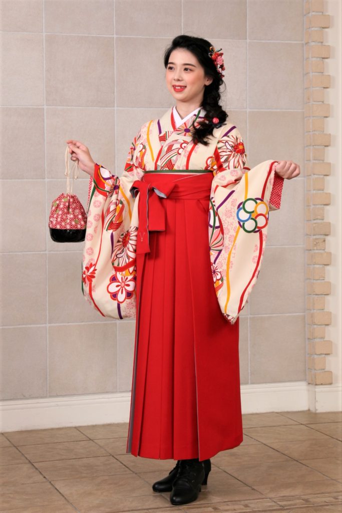 白地に映えるビビットな色づかいの文様が、個性的で華やかな一着。赤の袴をあわせて、卒業袴ならではの可愛らしさを楽しんで!卒業袴の≪福茂≫なら、レトロから最新トレンドまで地域一番の品揃え!