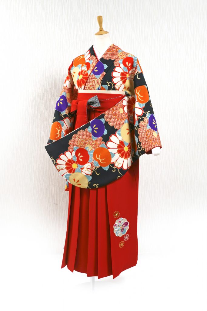 黒地に描かれた、大振りで色鮮やかな牡丹、菊、橘。刺繍の個性がひと際目を引く赤の袴と合わせて、大胆なコーディネートがおすすめです!卒業袴の≪福茂≫ならレトロから最新トレンドまで地域一番の品揃え!