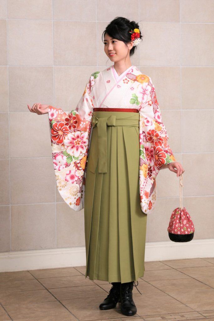 赤やピンクの花々で彩られた華やかで可愛い白地の着物。抹茶グリーンの袴をあわせて、柔らかな印象をプラス。卒業袴の≪福茂≫なら、レトロから最新トレンドまで地域一番の品揃え!