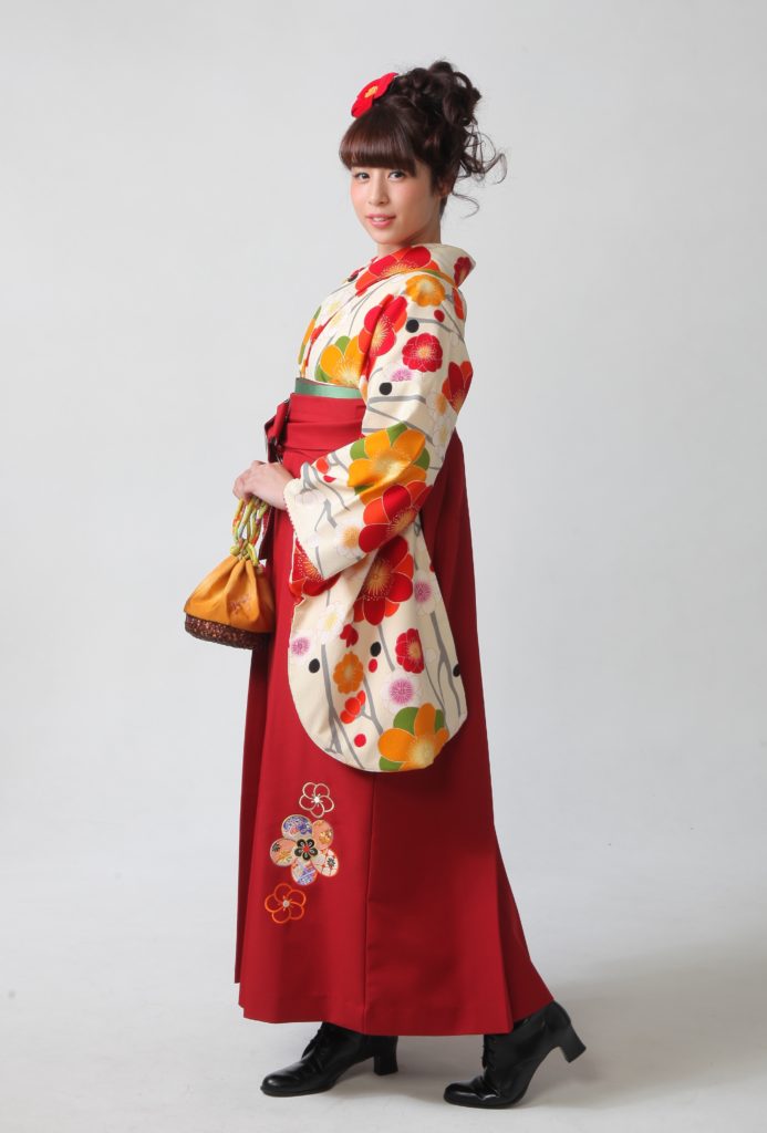 クリーム地に赤や橙の梅の花が、とても可愛い着物です。赤の袴をあわせて、より可愛く華やかに卒業式を彩ります。卒業袴の≪福茂≫ならレトロから最新トレンドまで地域一番の品揃え!