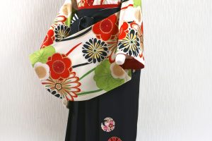 明るいグリーンに、オレンジ・赤などの梅の花が描かれた、爽やかな着物。ぱっと華やかで可愛い雰囲気がお好きな方に、お勧めのコーディネートです。卒業袴の≪福茂≫ならレトロから最新トレンドまで地域一番の品揃え!