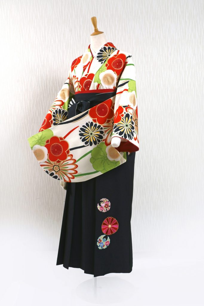 白・赤・黒・緑・金の5色のコントラストが、写真映え抜群な一着。黒の袴で全体を引き締めるのも、いいでしょう。多くの学生さんに人気のトレンド柄です。卒業袴の≪福茂≫ならレトロから最新トレンドまで地域一番の品揃え!