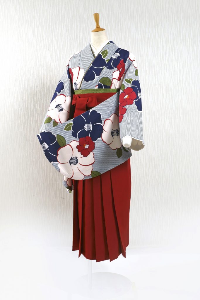 大胆な椿を細身のストライプに合わせたスタッフ一押しの一着。合わせる袴で可愛くも大人っぽくも…、いろんなコーディネートを楽しめます。卒業袴の≪福茂≫ならレトロから最新トレンドまで地域一番の品揃え!