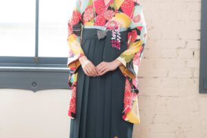 大人っぽくキメたい方におすすめ。着物に描かれた牡丹と匹田雲が印象を柔らかくします。黄緑の袴をあわせて、より華やかに。卒業袴の≪福茂≫ならレトロから最新トレンドまで地域一番の品揃え!