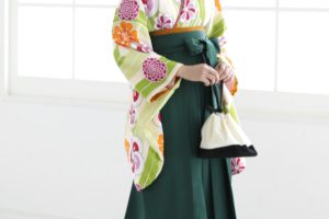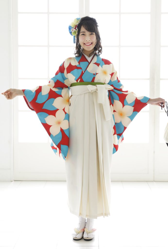 赤地の着物に大胆に描かれた「ヤマボウシ」の花が目を引く一着。白の袴でコーディネートすることで春らしくスッキリとした印象に。卒業袴の≪福茂≫ならレトロから最新トレンドまで地域一番の品揃え!