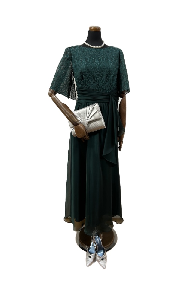 上半身のクラシカルなレースに、軽やかなオーガンジースカートが上品な一着。ウエストマークされたデザインでよりスタイリッシュに魅せてくれます。深いグリーンの色合いのドレスで、よりシックで大人なコーディネートを楽しんで頂けます。
