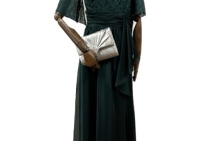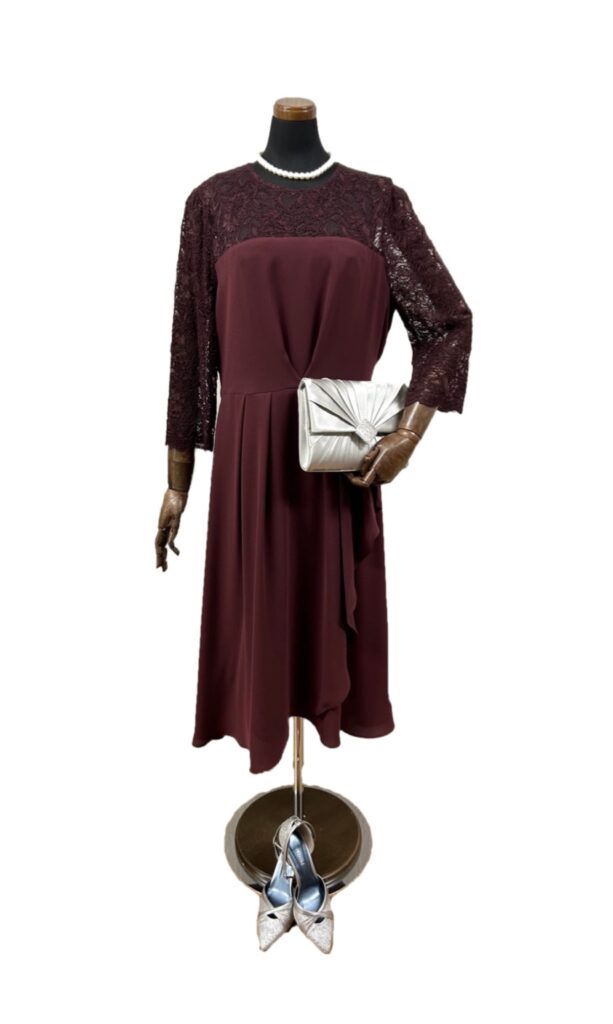 デコルテからお袖にかけてあしらわれたコードレースが上品なワインカラーのゲストドレス。ジョーゼットの落ち感のある素材と組合せ、シックで女性らしい華やかな印象を与えてくれます。