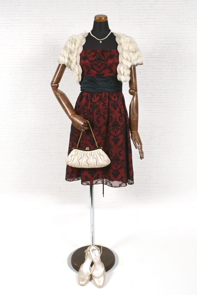 深みのある赤にフラワー刺繍が上品でクラシカルな印象。明るいベージュのボレロとバッグで、より華やかに。パーティドレスは5号から17号までご用意しています。バッグや靴、アクセサリーも豊富に取り揃えております。