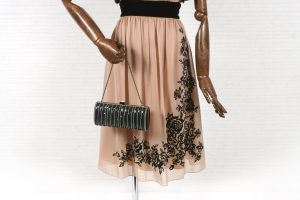 スカートのフラワープリントがアンティークな印象のドレス。ハイウエストからの切り返しでスタイルアップ効果も抜群です。パーティドレスは5号から17号までご用意しています。バッグや靴、アクセサリーも豊富に取り揃えております。