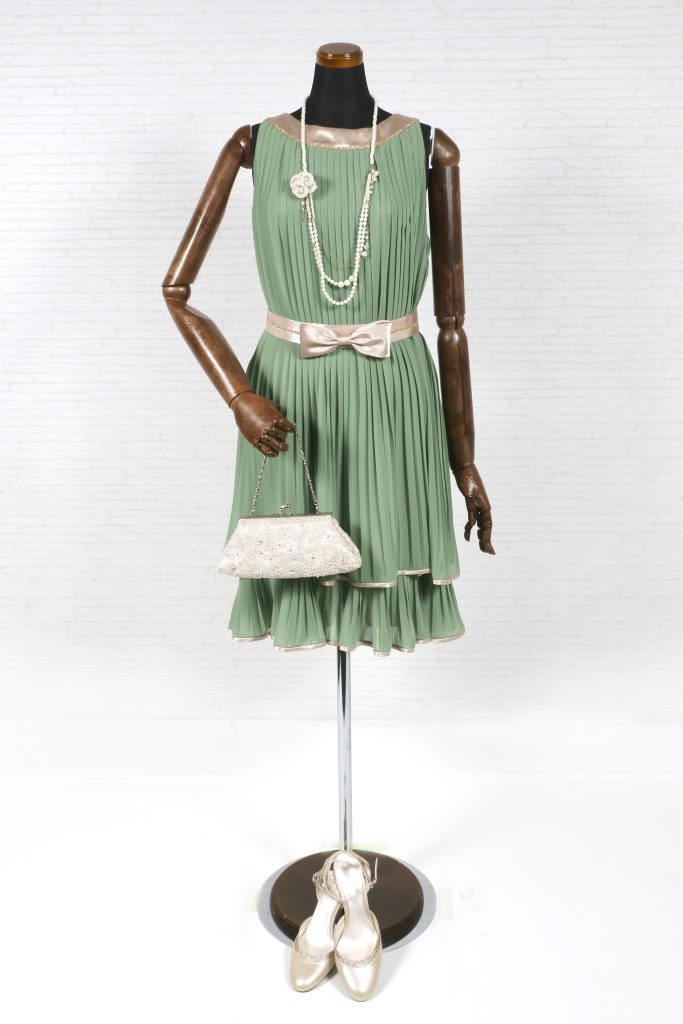 明るいグリーンのプリーツスカートが爽やかな印象。アクセントに使ったゴールドリボンが華やかさを添えます。パーティドレスは5号から17号までご用意しています。バッグや靴、アクセサリーも豊富に取り揃えております。