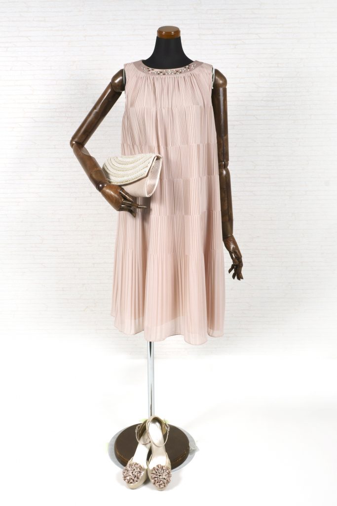 上品なピンクカラーと首元のビジューが、大人っぽく、エレガントなドレス。女性らしいけれど、甘すぎない一着です。パーティドレスは5号から17号までご用意しています。バッグや靴、アクセサリーも豊富に取り揃えております。