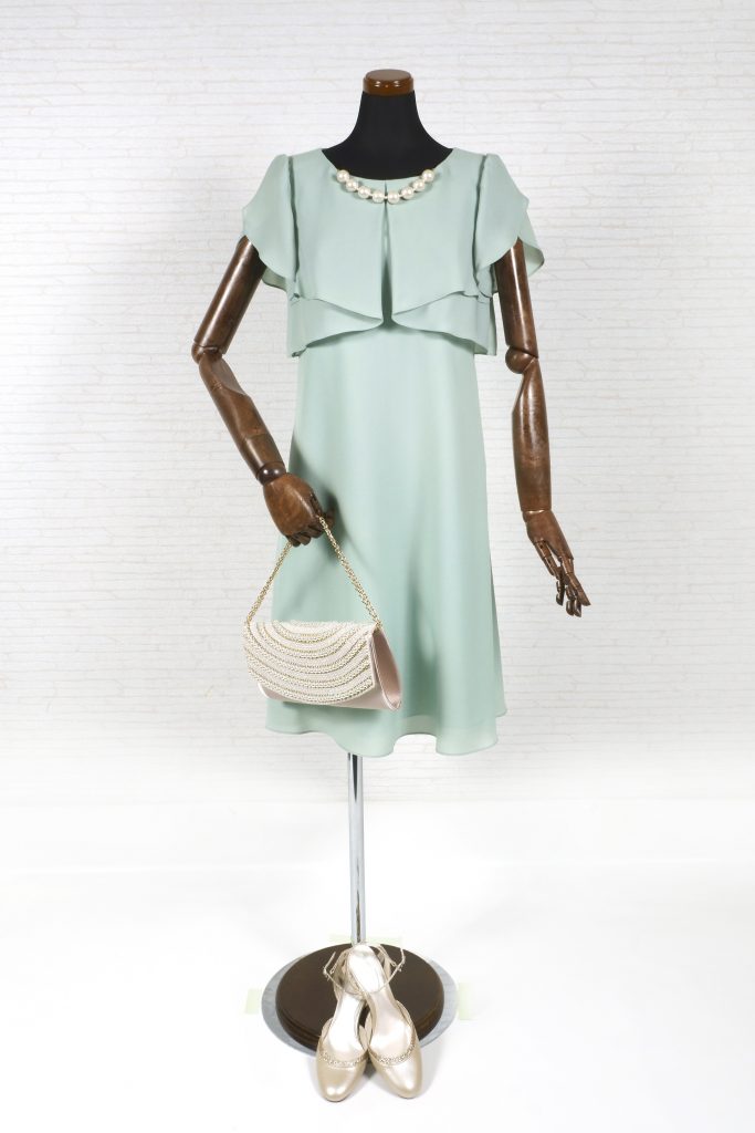 柔らかなミントグリーンのフェミニンなドレス。シンプルなラインと優しい色合いが、清楚で気品あふれる女性を演出してくれます。パーティドレスは5号から17号までご用意しています。バッグや靴、アクセサリーも豊富に取り揃えております。